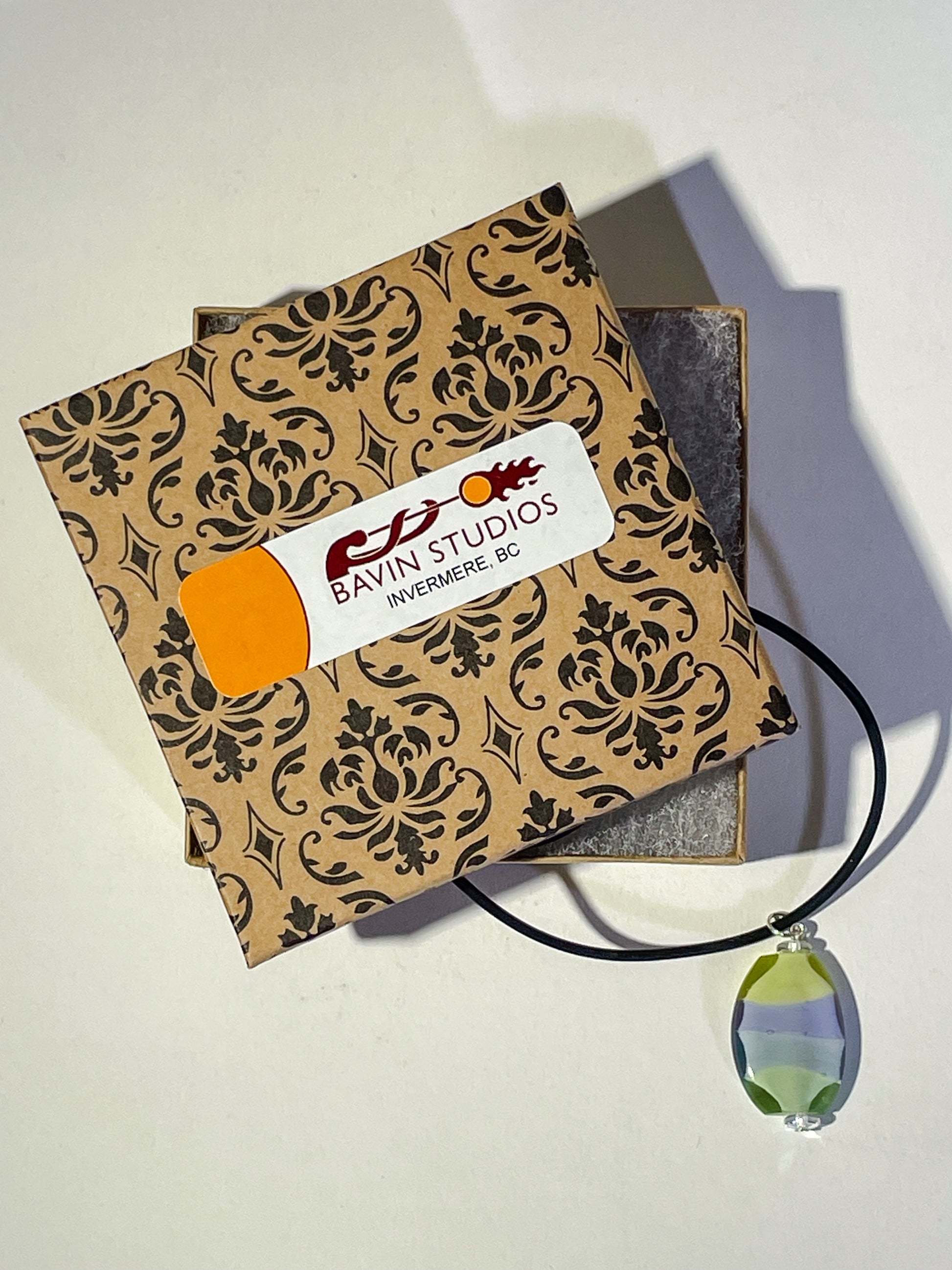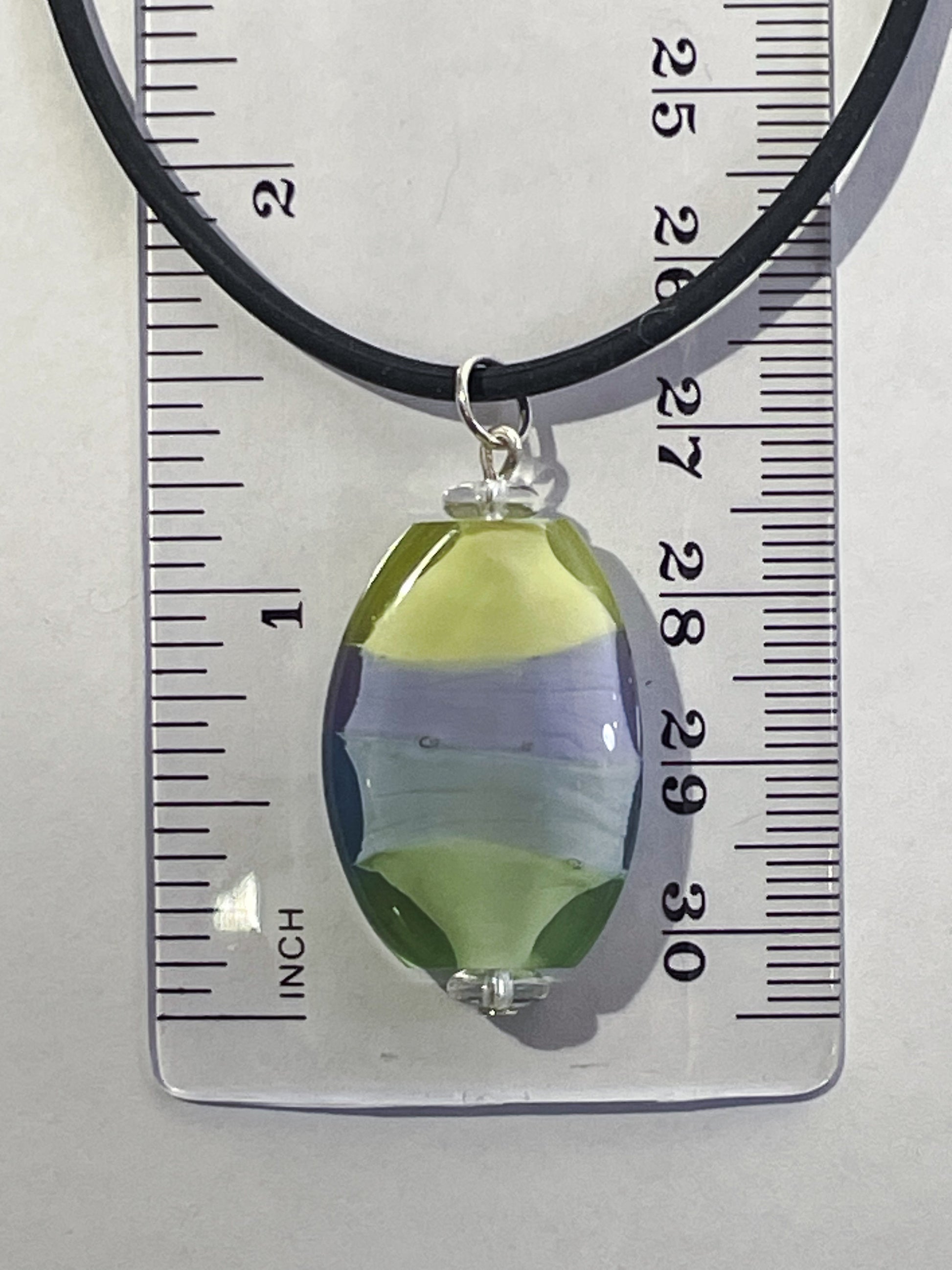 Handcrafted glass pendant by Tina Nowatschin, strung on a 16” Silicone necklace cord with friction clasp.