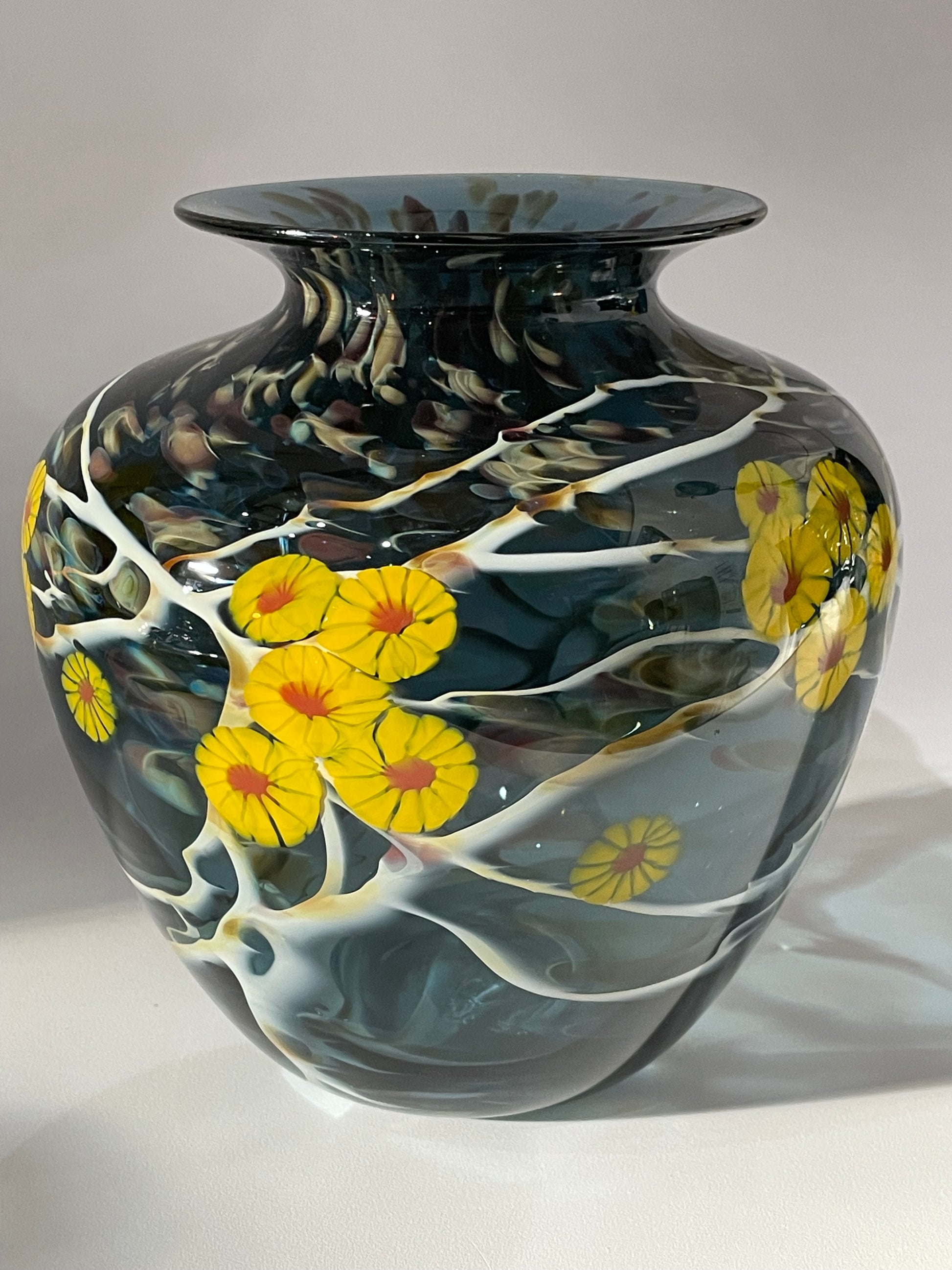 The Wind Flower series began in late 2023 but stems from one of Bavin’s longest running series; the Wind series, which was conceived in 1989. The glass flowers, called Millefiori, are first made separately in a lengthy process. The colours of glass for the flower petals and centre are melted separately, shaped and pulled out into long canes. Once cooled, the canes are carefully clustered together to form the flower pattern, melted into one piece, and then stretched out into a cane that will later be cut into small sections to be used in the creation of a vase. The Italian term “Millefiori” translates to “thousand flowers,” which not only refers to the decorative elements we have created, but also the vase function of these vessels.